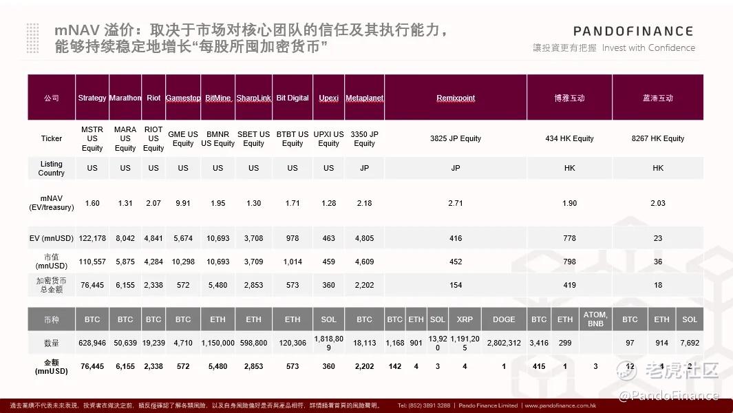 此外,加密货币财务公司的股票是普通投资者除了加密货币交易所交易基金(ETF)之外的另一种投资工具,由于监管限制,ETF 在某些国家或地区可能被禁止。同时,不同财库公司的杠杆比率、溢价水平均有不同,可以给不同的不同风险偏好的投资者来带多样化的选择。