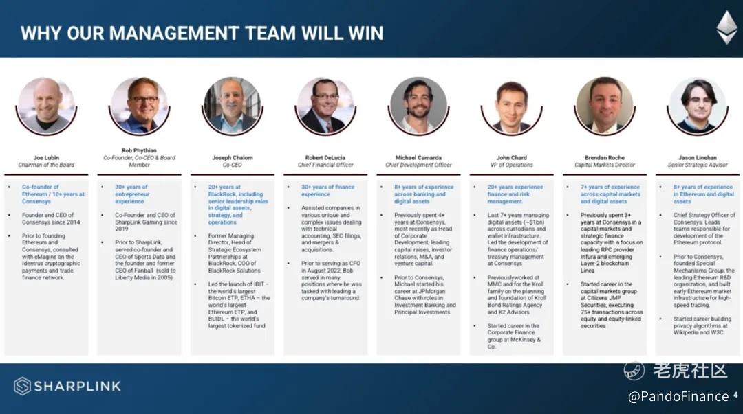 总体来看,SharpLink的管理层融合了传统金融、数字资产和区块链创新的深厚专业知识,这使公司能够推出Nasdaq上市的以以太坊为核心的国库战略,展现出强大的市场竞争力和前瞻性。