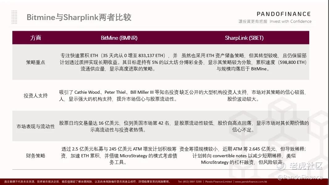 BitMine 与 SharpLink 均透过以太坊资产储备策略寻求企业价值的提升,但 BitMine 凭借 Tom Lee 的领导、强大的散户影响力(如 Cathie Wood、Peter Thiel)以及快速的 ETH 累积速度,成为市场焦点,其 mNAV 与股票表现均领先 SharpLink。SharpLink 虽然在 ETH 持仓上位居第二,但其管理层众星云集,实力不俗,未来在囤积以太坊的过程中机构融资的优势将有望显现。