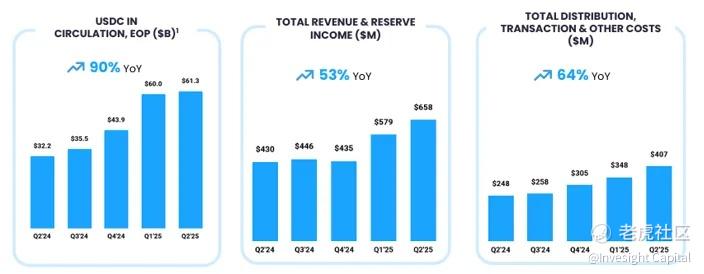 Circle 2025 年第二季度财报延续了高速发展的态势,USDC 流通量同比大增 90% 至 613 亿美元,并在 8 月 10 日进一步增至 652 亿美元,显示出稳定币需求的持续走强。总营收及储备收益同比增长 53% 至 6.58 亿美元,其中储备收益增长 50% 至 6.34 亿美元,主要受平均流通量大幅提升驱动,其他收入同比大增 252% 至 2400 万美元。虽然公司录得 4.82 亿美元净亏损,但主要是 IPO 相关的 5.91 亿美元非现金支出所致,剔除这些因素后,调整后 EBITDA 同比增长 52% 至 1.26 亿美元,体现了业务扩张带来的经营杠杆效应。