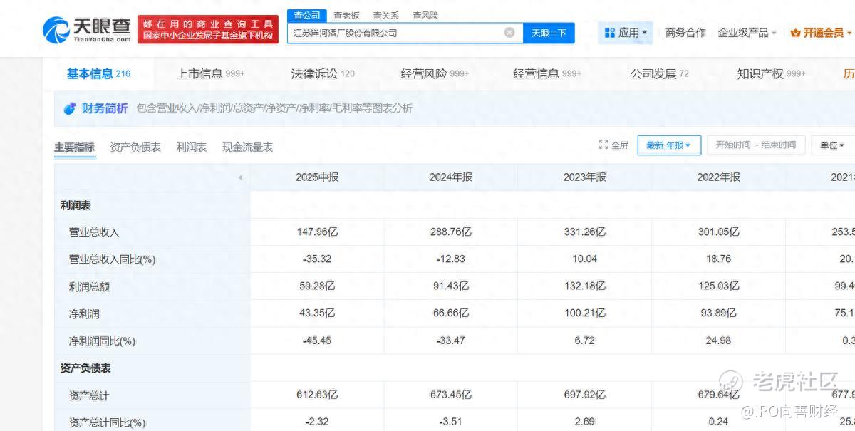 天眼查APP显示:今年上半年,洋河实现营业收入147.96亿元,同比下滑35.32%;归属净利润43.44亿元,同比下滑45.34%。