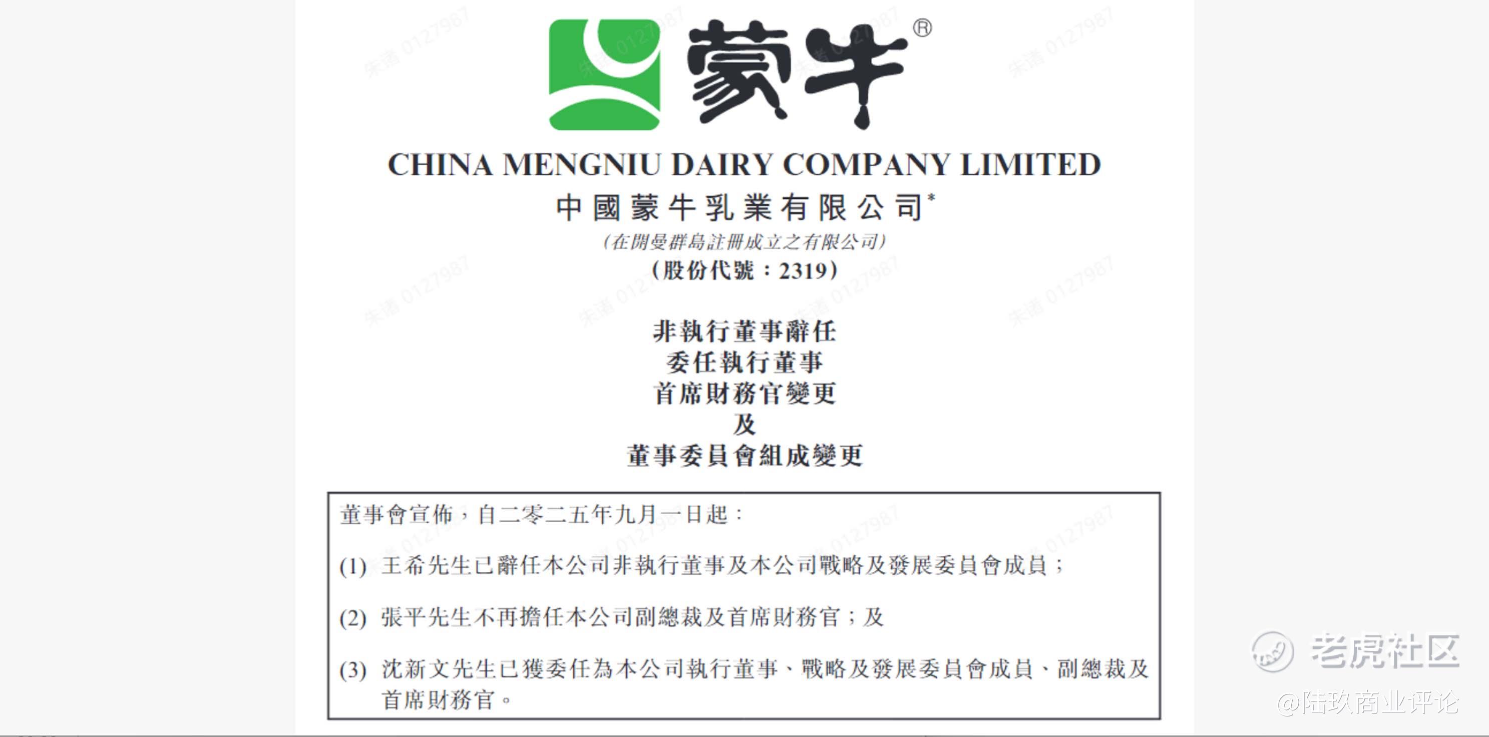 8月27日,随着蒙牛2025年中报的发布,一则关于CFO变更的公告随即发出。公告称,张平先生因届退休年龄,将不再担任副总裁及首席财务官,沈新文先生已获委任为执行董事、战略及发展委员成员、副总裁及首席财务官。