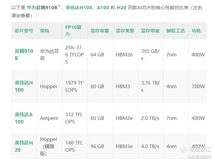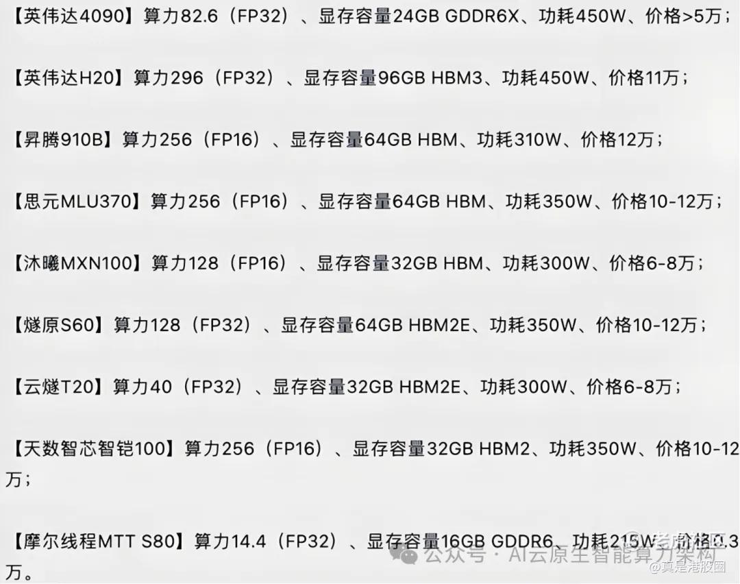 从参数上看,**的芯片在7nm上,跟英伟达的阉割产品相差不大。但评价算力芯片包括算力、功效、带宽、定价、生态等要素。从这里看,还是性价比不足,其中不但是价格问题,一个Cuda,就足以让性能释放差个一倍了。