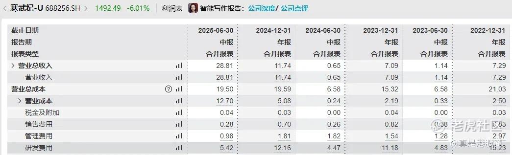 创新药也是亏损先行,兑现在后,但往往越高期待的公司越敢亏,亏得不够多正是天花板低的迹象,从这点看,说大故事,大亏损状态下才合理。而且,初期低盈利,高研发,赚多少再投入多少,不躲周期,是应该的。但看寒武纪当前的业绩表现,有小富则安的倾向。