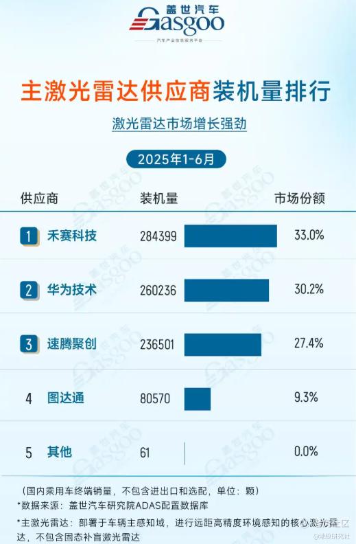 根据盖世研究院2025年1月—6月激光雷达装机量数据,禾赛继续稳居ADAS领域主雷达出货量第一,市场份额达33.0%。