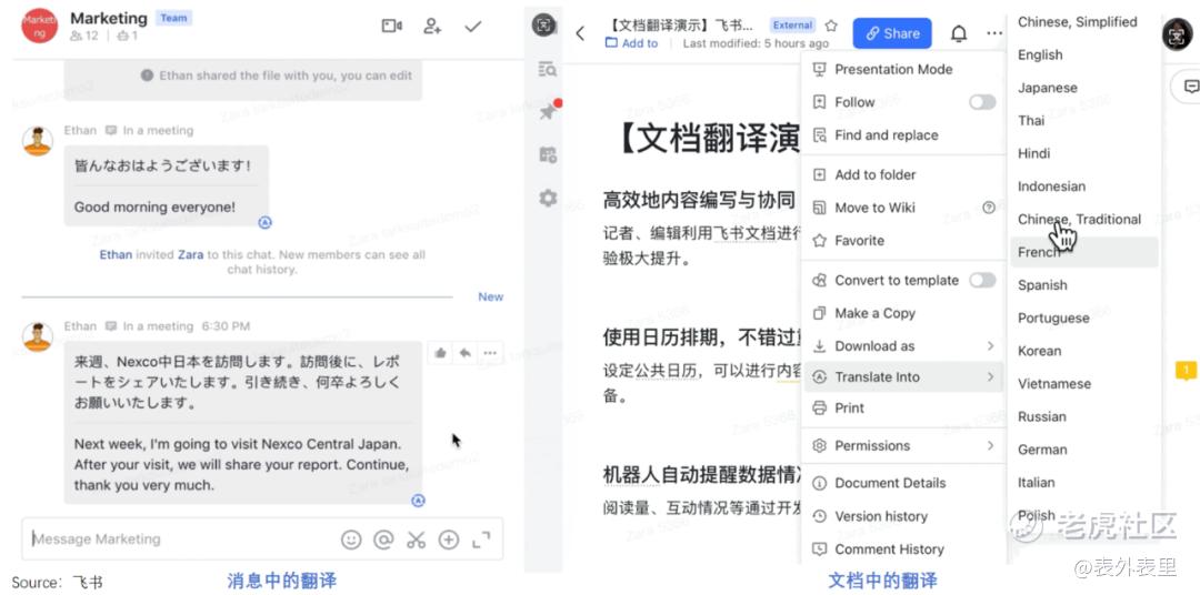 至于语言鸿沟,飞书覆盖20+种常用语言的实时翻译功能,可以在聊天、文档、会议等办公场景随时调用,极大缓解跨语言沟通的焦虑。