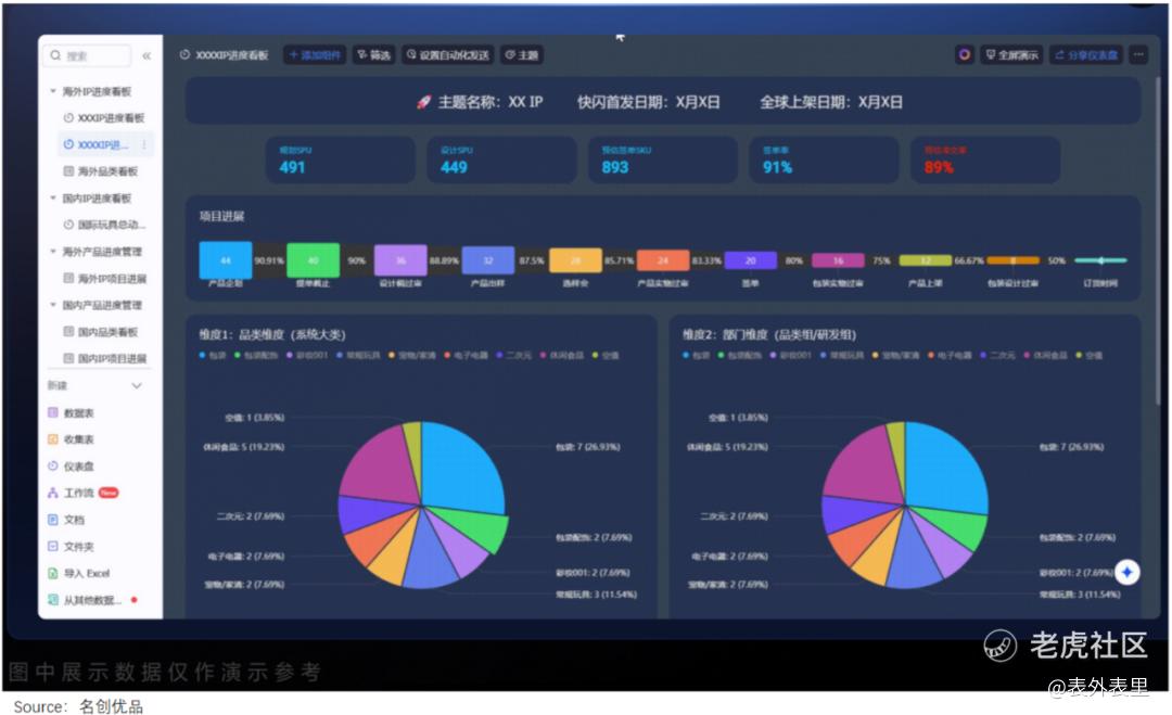 以名创优品为例,多维表格下的全球IP进度表,像一个可交互的数据大屏,直观展示了其真实业务的每一个细节:每个IP从商品研发、市场订货、采购回货以及出货再到产品上市,全链路监控;IP项下各品类产品、各协作业务部门的横向进度,也清晰展示。