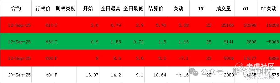 (1)腾讯:9月最大持仓范围500-620,窝轮牛熊街货分布545-630,今收605.5,上涨2.19%,期权盘路变化超过1000张的仓位如下,红色是增仓较大的仓位,绿色是减仓较大的仓位。大仓无论增减都是9月12日到期的周期权,有大佬下周会有大动作。