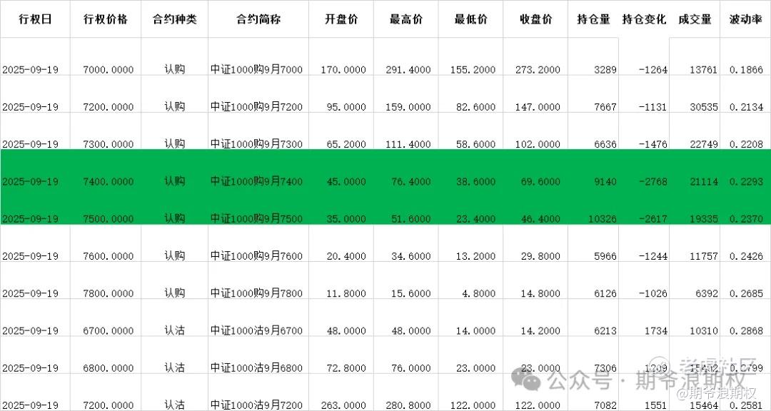 (4)中证1000期权:9月最大持仓范围6800-7500,今收7245.67,上涨2.90%,期权9月主力合约,认购全是减仓,集中在7000-8300,合计1.6W张;认沽以增仓为主,集中在6600-7200,合计6200张。值得注意的是,支撑位上移3档到6800的位置。今天变化超过1000张的如下图,绿色是减仓较大的仓位。