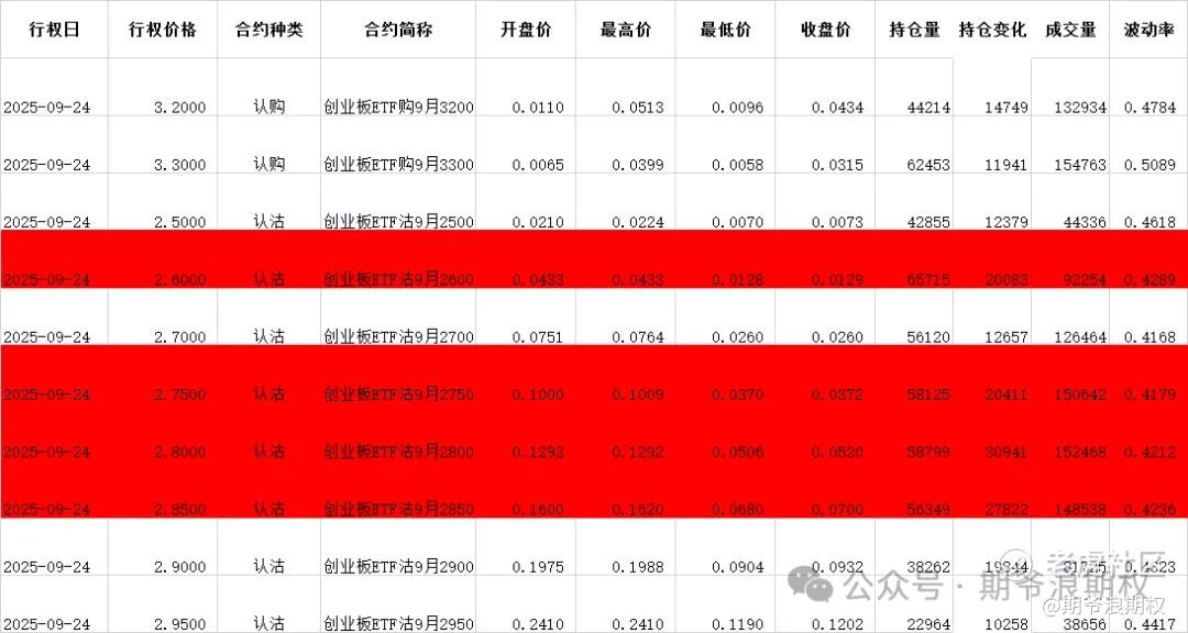 (3)创业板ETF期权:9月最大持仓范围2600-3000,今收2.944,上涨7.02%,期权9月主力合约,认购减仓集中在2800-2900,合计1.5W张,增仓集中在3000-3300,合计3.4W张;认沽以增仓为主,集中在2450-3000,合计18.6W张。值得注意的是,压力位上移3档到3000的位置。今天变化超过1W张的仓位如下,红色是增仓较大的仓位。