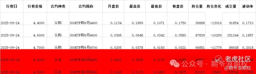 (1)沪深300ETF(沪)期权:9月最大持仓范围4500-4600,今收4.554,上涨2.20%,期权9月主力合约,认购全是减仓,集中在4400-5000,合计6.0W张;认沽是低行权价减仓高行权价增仓,减仓较少,增仓集中在4400-4600,合计6.1W张。值得注意的是,阻力位上移一档到4500的位置。今天变化超过1W张的仓位如下,红色是增仓较大的仓位。