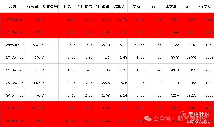 (2)美团:9月最大持仓范围115-120,窝轮牛熊街货分布90-125,今收103.0,上涨1.58%,期权盘路持续热闹,变化超过1000张的仓位如下图,红色是增仓较大的仓位。随着整体大盘的向好,美团今天也开始变得乐观起来,虽然整体还是以避险为主,但行权价总体有所上移,市场开始变得乐观一点了。