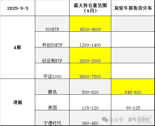 接下来行情会怎么样,富婆复盘来找方向。下图是今天大A的3个ETF和一个指数,以及港股的腾讯、美团和宁德时代的最大持仓量范围以及窝轮牛熊分布范围,也就是9月的资金筹码分布,黄色的表示跟上个交易日有变动。