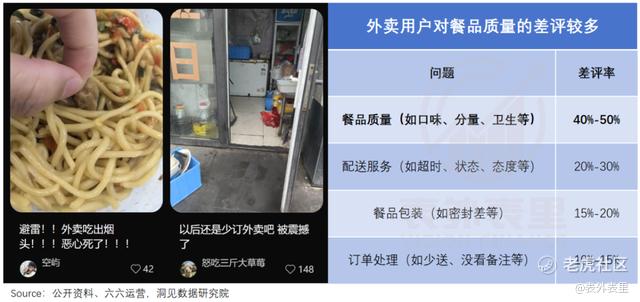 翻翻社交平台,“外卖”关键词下,吃出异物、菜品缩水等吐槽比比皆是。有数据显示,目前外卖差评中,对餐饮“品质”不满的比例高居第一。