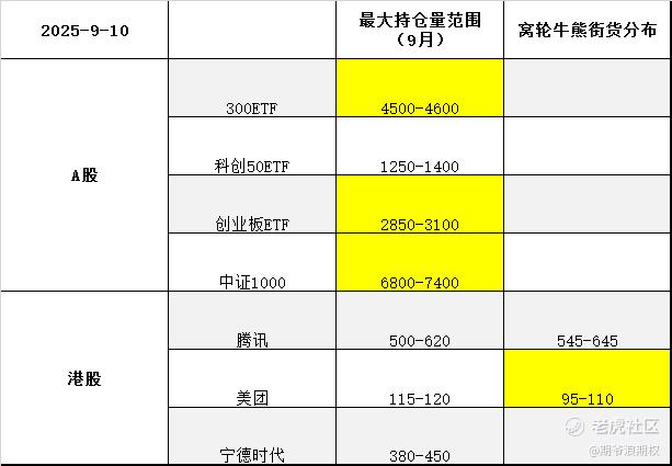 下图是今天大A的3个ETF和一个指数,以及港股的腾讯、美团和宁德时代的最大持仓量范围以及窝轮牛熊分布范围,也就是9月的资金筹码分布,黄色的表示跟上个交易日有变动。