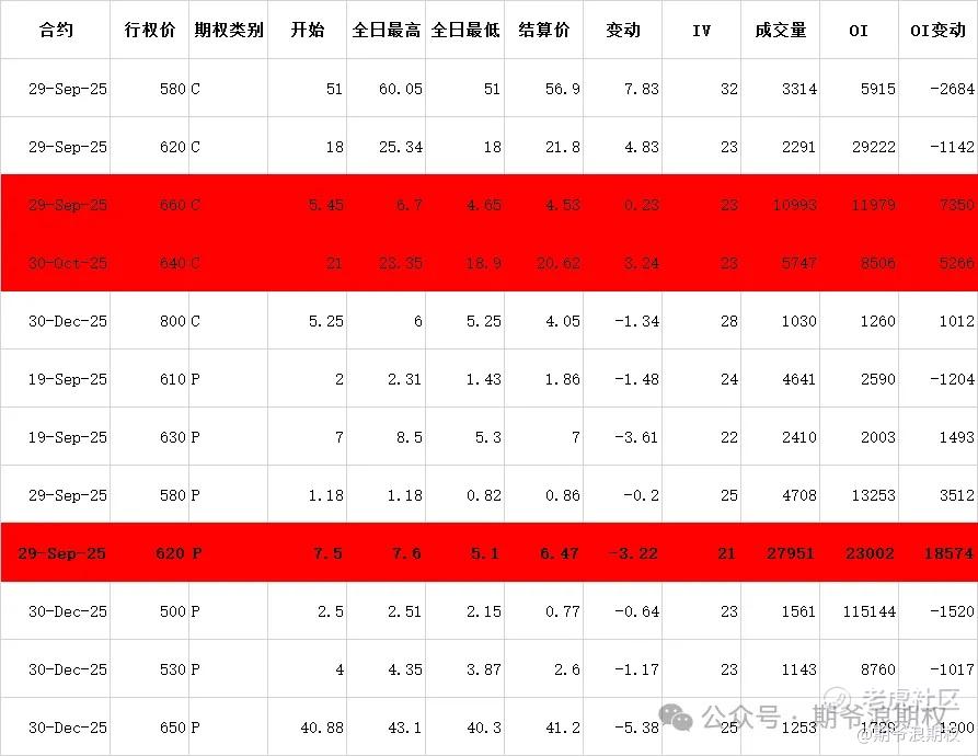 (1)腾讯:9月最大持仓范围500-620,窝轮牛熊街货分布545-645,今收633.5,上涨1.04%,期权盘路变化超过1000张的仓位如下,红色是增仓较大的。总体来看,腾讯大概率有继续上涨的趋势,而且增仓比昨天加大,下一步700指日可待的赶脚。