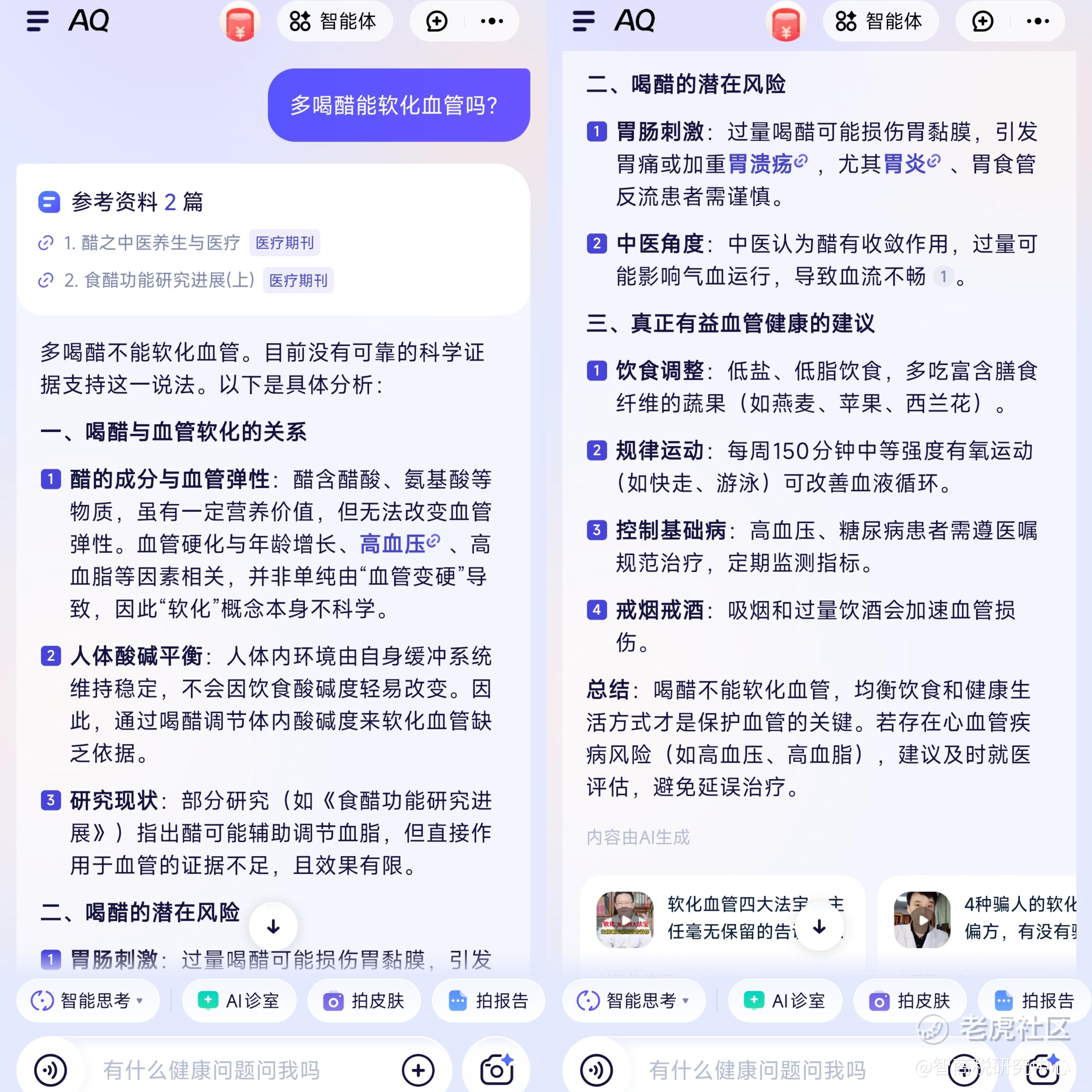 同时,对于多喝醋的潜在风险,软化血管的相关建议,AQ也能在回答时一并给出,消除了用户脑子里的大大问号。