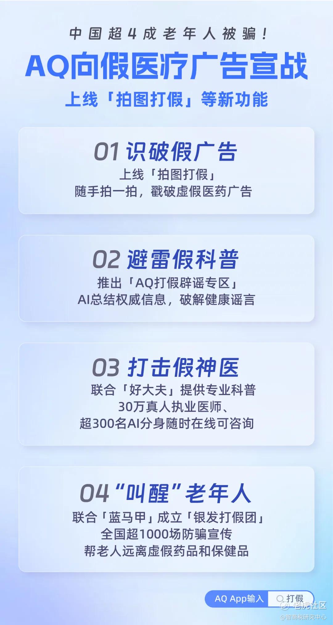 另一边,社会各界也向着虚假医疗产品、保健品,挥出了反击利刃!例如前不久,AQ就宣布向假医疗广告宣战,上线了“拍图打假”等新功能。搭建平台级能力甄别假药、上线辟谣专栏、合作全国助老组织“蓝马甲”。