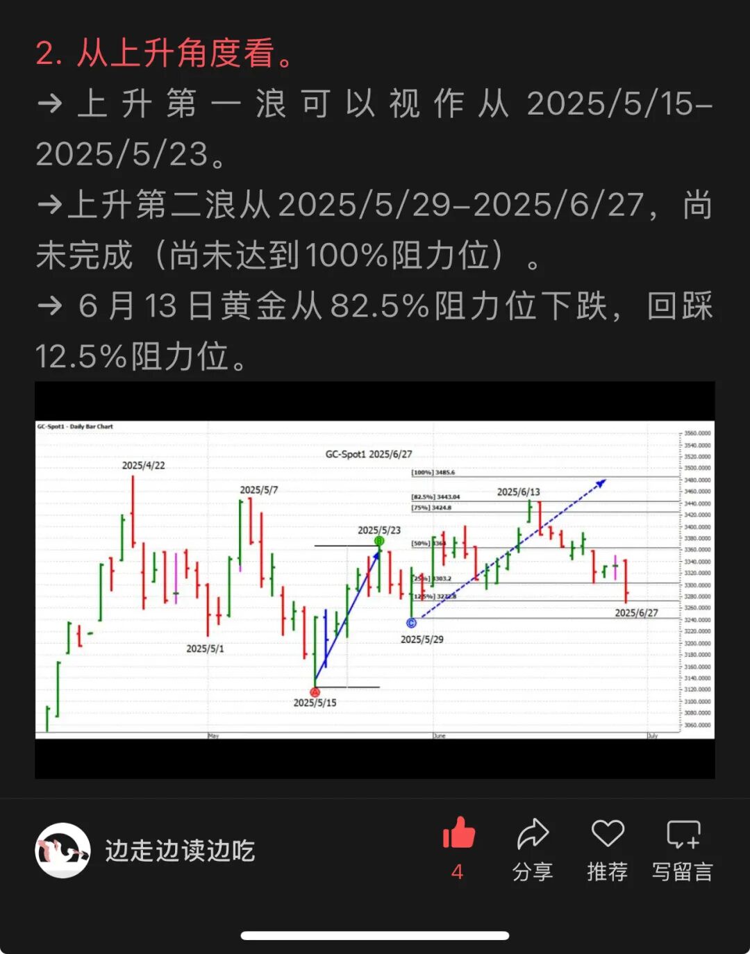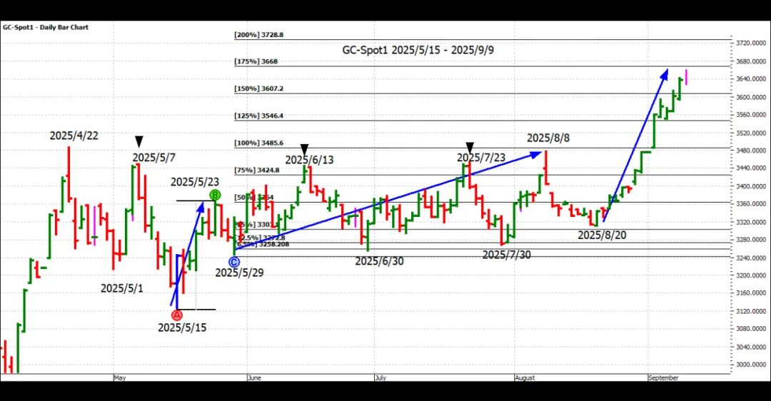 → (此前黄金在2025/6/30回踩6.5%阻力住,在2025/7/30回踩12.5%阻力位,加上8月20日回踩25%阻力位,也就是说有三次在测试底部,并且底部逐渐抬高)。