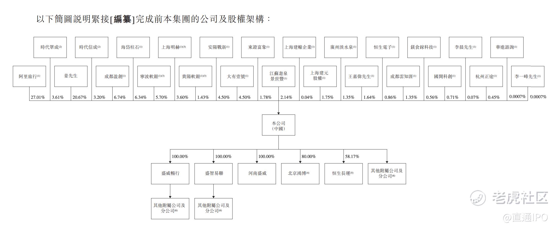 招股书显示,截至最后实际可行日期,阿里通过阿里旅行持有盛威时代27.01%的股权,为第一大股东。此外,创始人姜生喜、王嘉伟、成都盈创、盈创世纪、余浪先生、海岱柱石、陈树林先生、时代众成及时代信成于本公司股东大会上共同有权控制行使约42.20%投票权,为盛威时代一组控股股东。