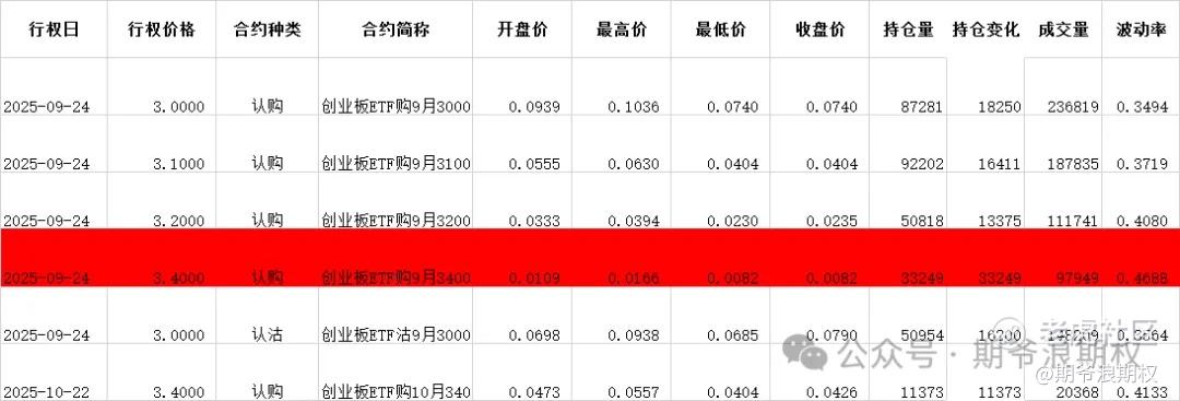 (3)创业板ETF期权:9月最大持仓范围2850-3100,今收2.995,下跌0.99%,期权9月主力合约,认购是有增有减,减仓较少,增仓集中在3000-3400,合计8.5W张;认沽以增仓为主,集中在2800-3100,合计3.8W张。变化超过1W张的仓位如下图,红色是增仓较大的。