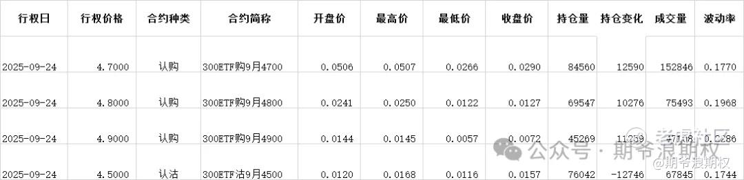 (1)沪深300ETF(沪)期权:9月最大持仓范围4500-4600,今收4.621,下跌0.84%,期权9月主力合约,认购是低行权价减仓高行权价增仓,减仓较少,增仓集中在4600-5000,合计4.7W张;认沽以减仓为主,集中在4400-4600,合计2.2W张。变化超过1W张的仓位如下图: