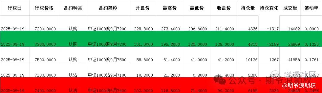 (4)中证1000期权:9月最大持仓范围7000-7500,今收7422.88,上涨0.31%,期权9月主力合约,认购减仓集中在7000-8400,合计5200张,增仓集中在7500-7600,合计1600张;认沽是低行权价减仓高行权价增仓,减仓集中在6600-7000,合计2700张,增仓集中在7100-7500,合计4400张。值得注意的是,压力位上移1档到7500。变化超过1000张的仓位如下图,红色是增仓较大的,绿色是减仓较大的。