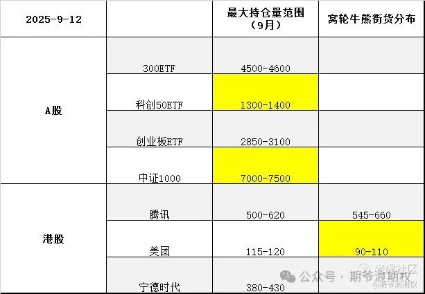 下图是今天大A的3个ETF和一个指数,以及港股的腾讯、美团和宁德时代的最大持仓量范围以及窝轮牛熊分布范围,也就是9月的资金筹码分布,黄色的表示跟上个交易日有变动。