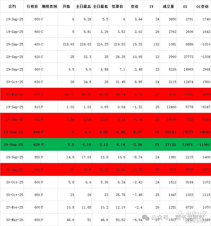 (1)腾讯:9月最大持仓范围500-620,窝轮牛熊街货分布545-660,今收643.5,上涨2.22%,期权盘路变化超过1000张的仓位如下,红色是增仓较大的,绿色是减仓较大的。总体感觉,腾讯随时准备冲刺700,富婆感觉今年年底能到800,然后拆分。