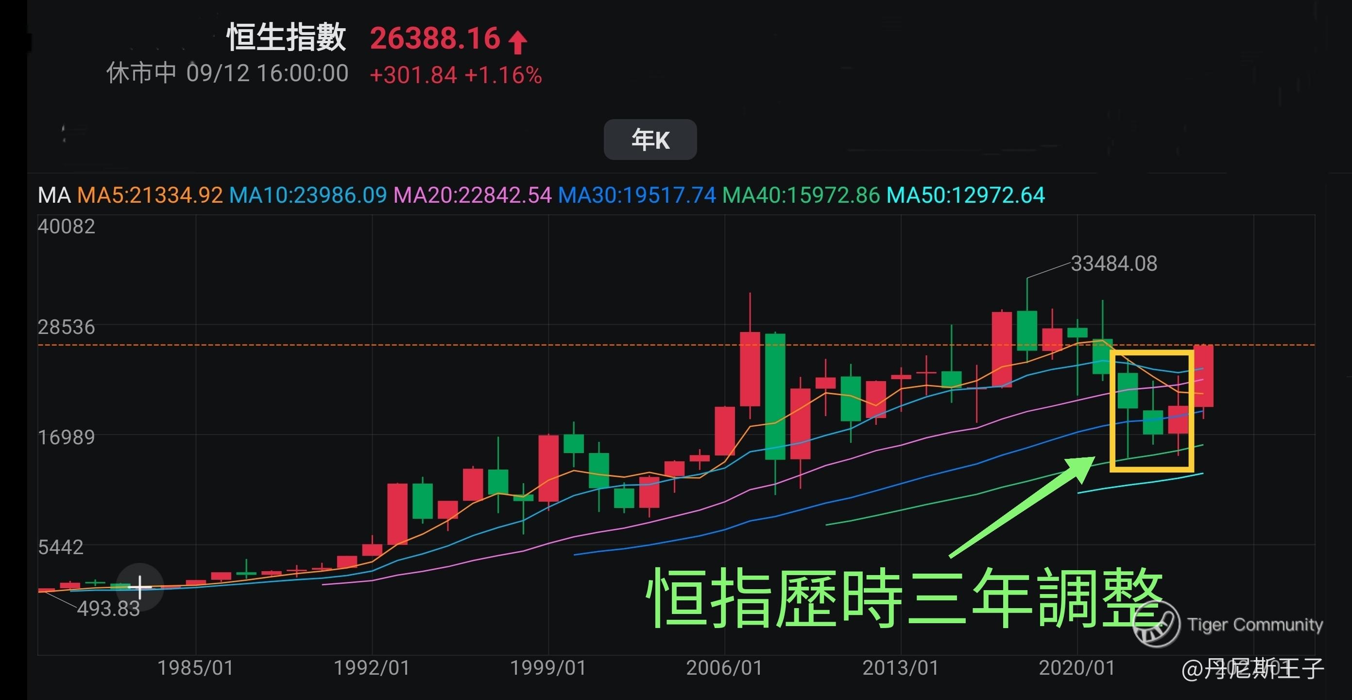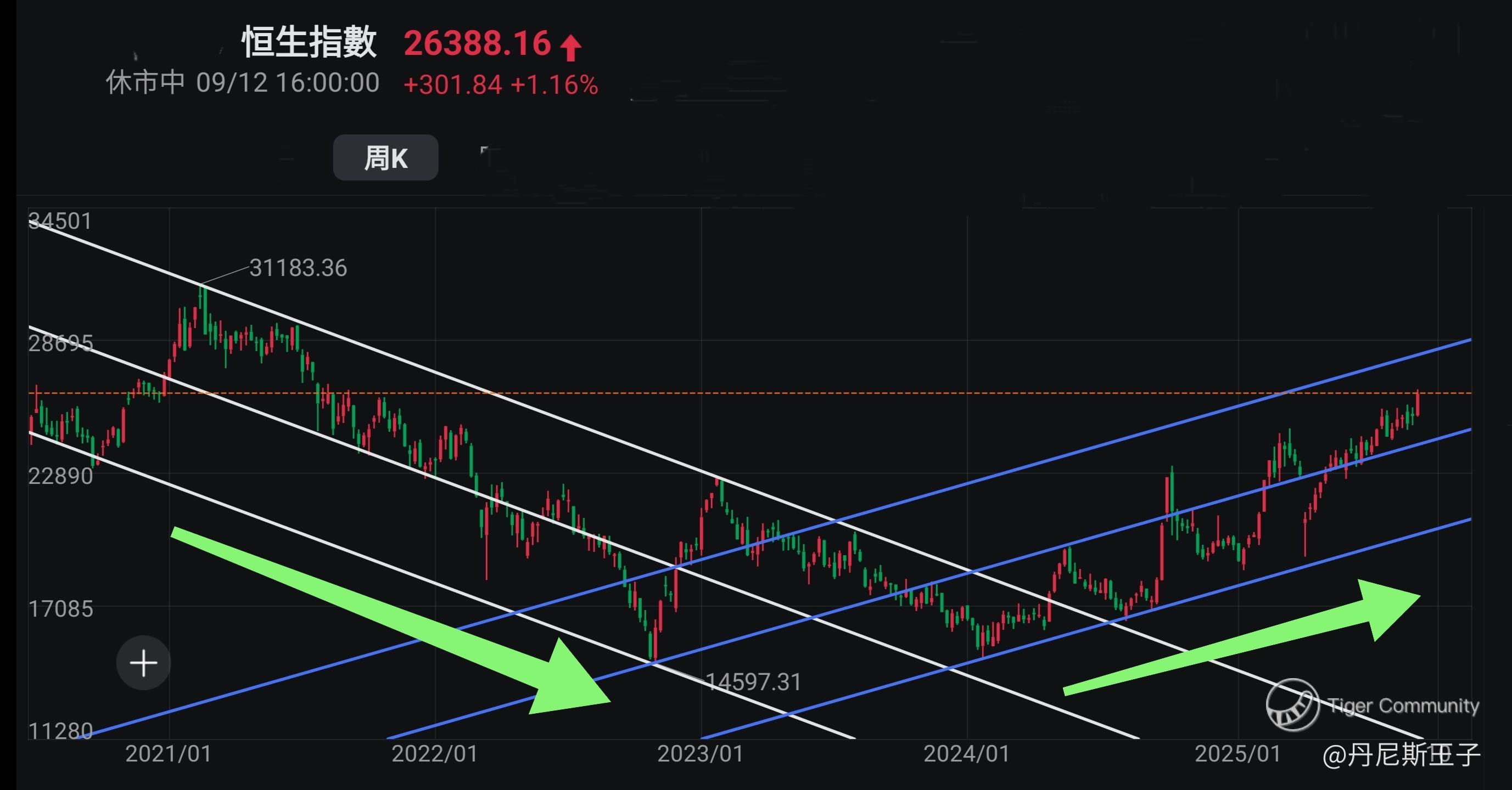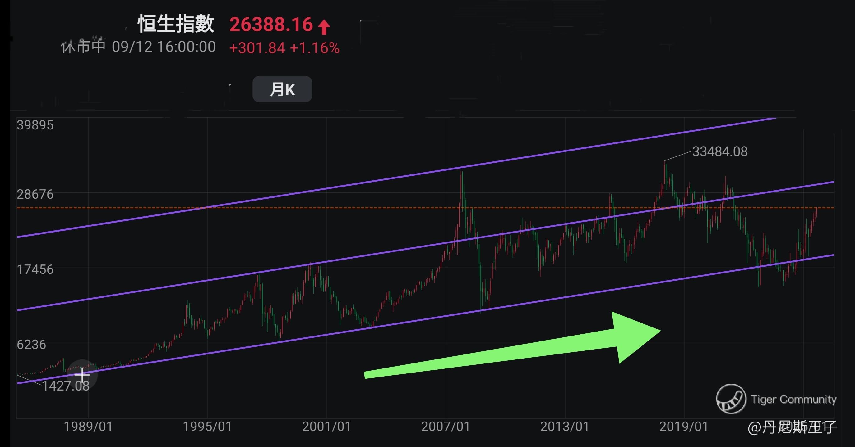 恒生指数自1989年起展开一个大型上升浪,虽然多年来曾遇到不少风浪,但到今天依然在上升通道线里,指数创历史新高相信是迟早之事。