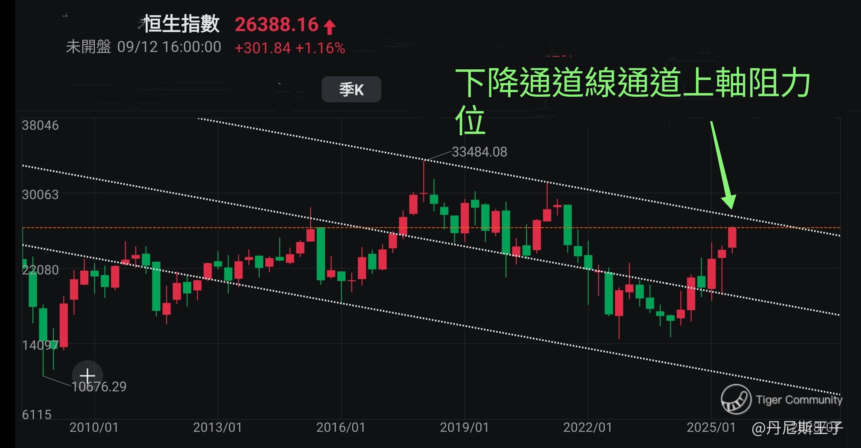 从季线图所见出现了一条白色虚线的下降通道线,恒生指数有机会于下降通道线上轴遇阻力回落,此阻力位约27400点。不知第四个高点会否就是此下降通道线上轴阻力位。