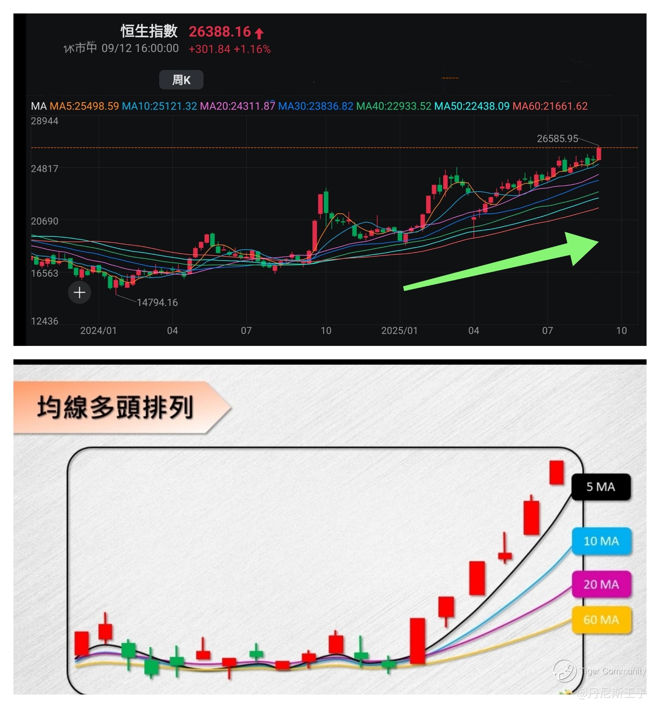 恒生指数周线图多动移动平均线呈多头排列,突显强势。