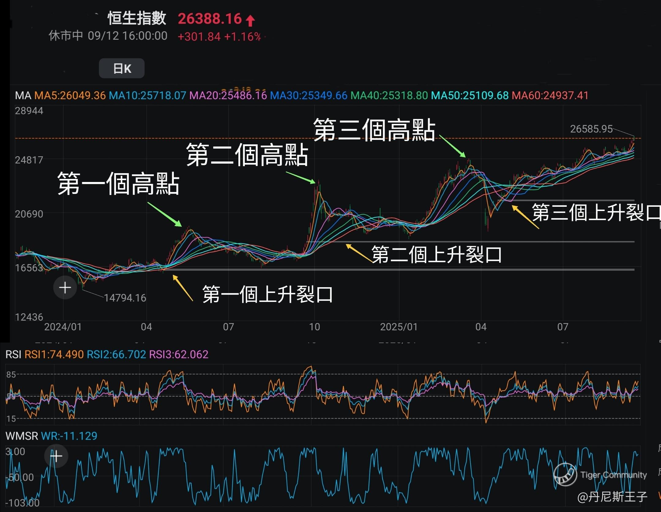 从日线图所见恒生指数由2024年至今出现了三个高点和三个上升裂口,那第四个高点会在何时出现?