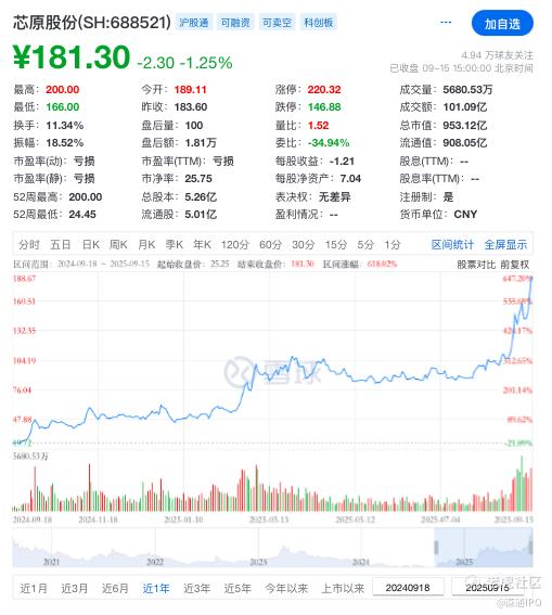 受“并购”芯来科技消息影响,9月12日开盘后,芯原股份持续走高,午间收盘前收获芯20CM涨停,报183.6元,总市值965.21亿元。今日,芯原股份微跌1.25%报收于181.3元,总市值953.12亿元。如果把时间周期设置在近一年来,该公司更是实现了从52周最低24.45元,至52周最高200元,超7倍的暴涨。