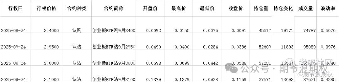 (3)创业板ETF期权:9月最大持仓范围2850-3100,今收3.037,上涨1.40%,期权9月主力合约,认购是低行权价减仓高行权价增仓,减仓集中在2900-3000,合计1.3W张,增仓集中在3100-3400,合计4.1W张;认沽以增仓为主,集中在2700-3200,合计7.8W张。变化超过1W张的仓位如下图: