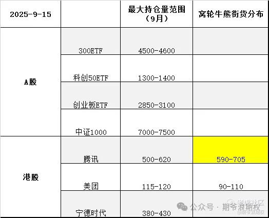 下图是今天大A的3个ETF和一个指数,以及港股的腾讯、美团和宁德时代的最大持仓量范围以及窝轮牛熊分布范围,也就是9月的资金筹码分布,黄色的表示跟上个交易日有变动。