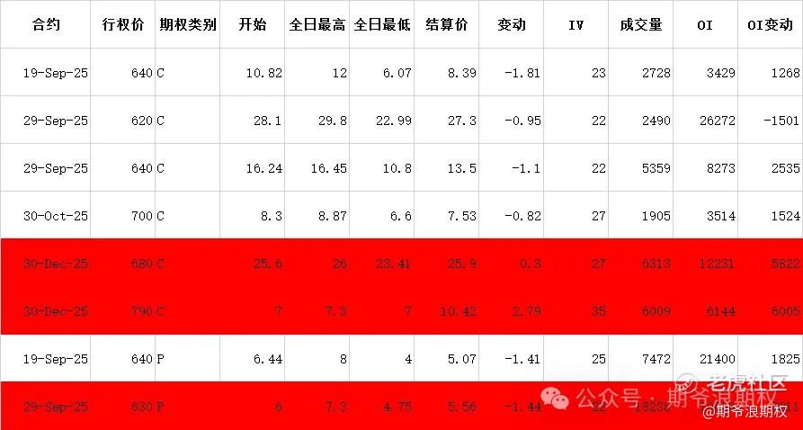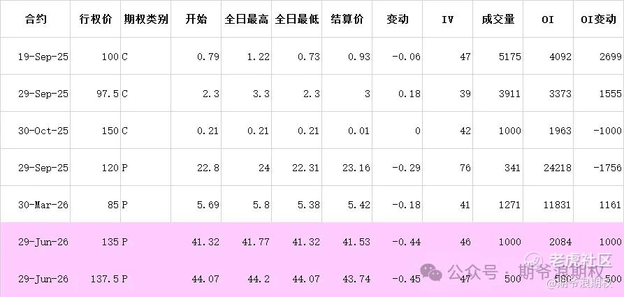 (2)美团:9月最大持仓范围115-120,窝轮牛熊街货分布90-110,今收97.35,上涨0.83%,多空仍然在100这个位置对战。期权盘路稍微冷清了一些,变化超过1000张的仓位如下图,粉红色的是深度实值增仓。从上周五开始到今天,已经是连续两个交易日都有粉色深度实值沽,而且都是明年6月的深度实值沽增仓,上周五5500张,今天1500张,合计7000张。港股是美式期权,也就是说有大佬总共手握5个亿现金,随时准备要买入美团的股票。大佬们不会无缘无故做大仓位的,大概率明年6月前美团将会反弹。