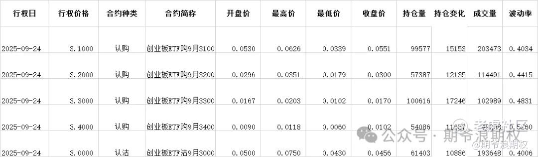 (3)创业板ETF期权:9月最大持仓范围2850-3400,今收3.059,上涨0.72%,期权9月主力合约,认购和认沽都以增仓为主。认购增仓集中在3000-3400,合计6.1W张;认沽增仓集中在2850-3100,合计3.8W张。值得注意的是,压力位上移2档到3400变化超过1W张的仓位如下图:
