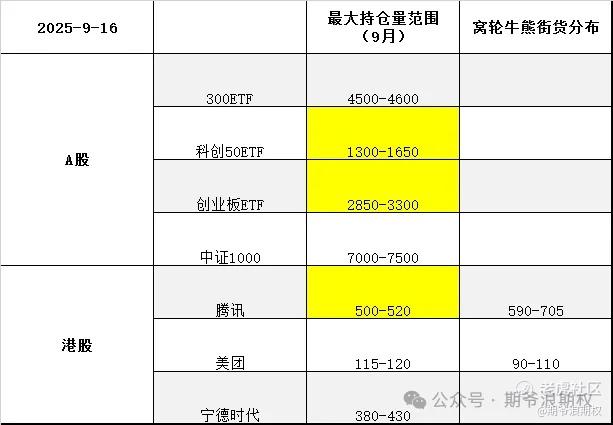 下图是今天大A的3个ETF和一个指数,以及港股的腾讯、美团和宁德时代的最大持仓量范围以及窝轮牛熊分布范围,也就是9月的资金筹码分布,黄色的表示跟上个交易日有变动。
