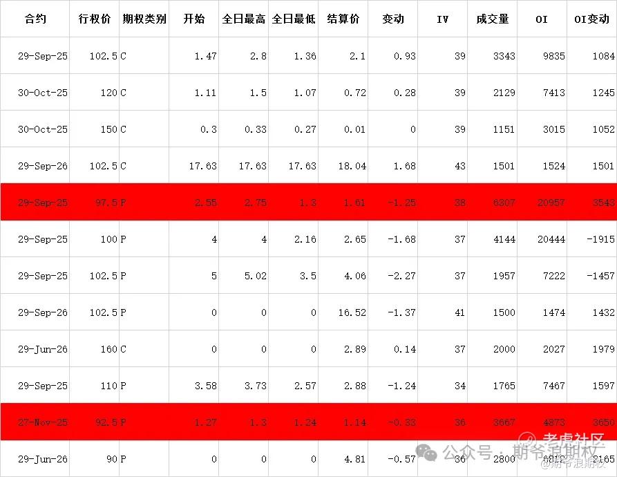 (2)美团:9月最大持仓范围115-120,窝轮牛熊街货分布90-110,今收100.30,上涨3.03%,多空仍然在100这个位置对战。期权盘路变化超过1000张的仓位如下图。总的来说,大佬们对美团有了积极的看法,也许他们觉得跌到底部,开始慢慢做多。