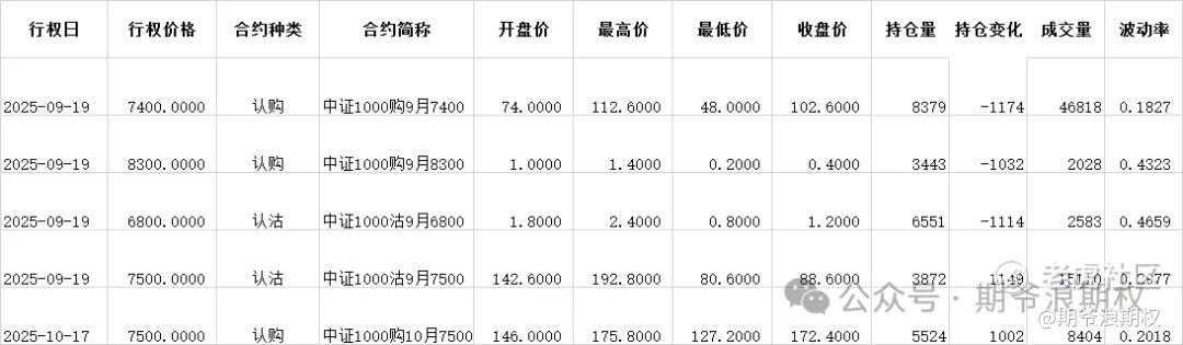 (4)中证1000期权:9月最大持仓范围7000-7500,今收7483.63,上涨0.92%,期权9月主力合约,认购几乎全是减仓,集中在7200-8300,合计5000张;认沽是低行权价减仓高行权价增仓,减仓集中在6600-7100,合计4200张,增仓主要是7500沽增仓1100张。变化超过1000张的仓位如下图: