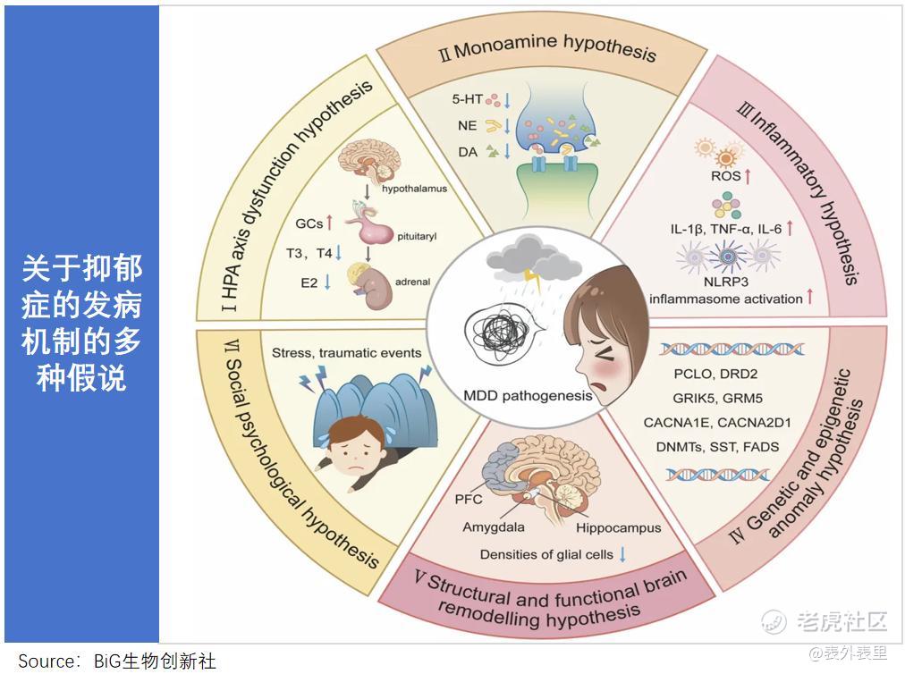 目前抑郁症发病机制尚未明确,被广泛接受的假说是与神经递质异常有关。大雷简单举例,5-羟色胺掌管着“幸福”“满足感”的开关,去甲肾上腺素让人更有活力,这些神经递质失衡,人的情绪就会“生病”。