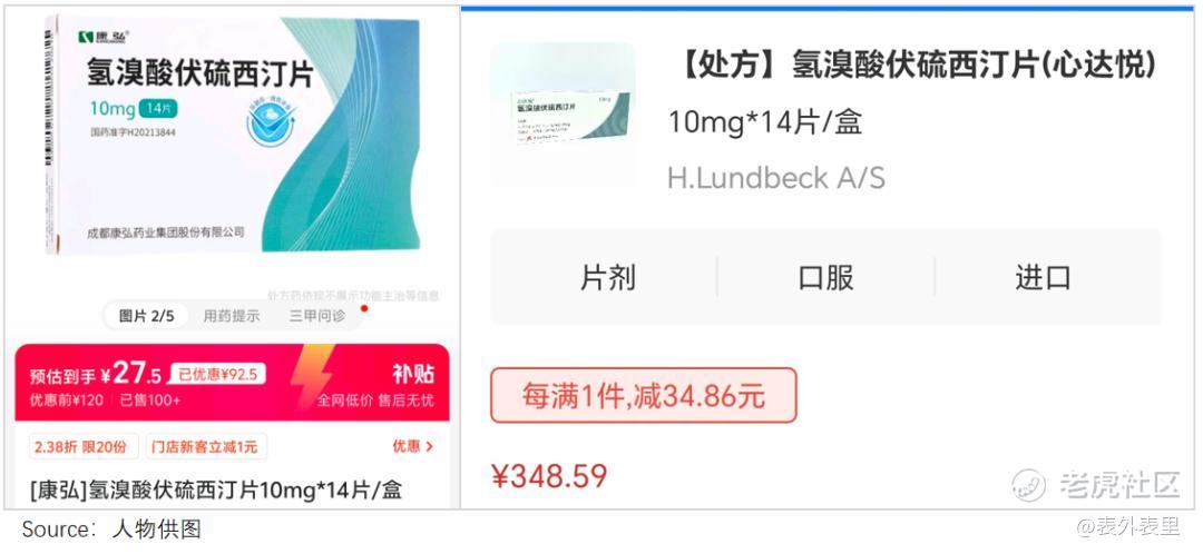 如今大雷打开购物APP,国产伏硫西汀价格已从500元打“骨折”至27.5元/盒,原研药的“皇冠”也松动,售价跳水40%。