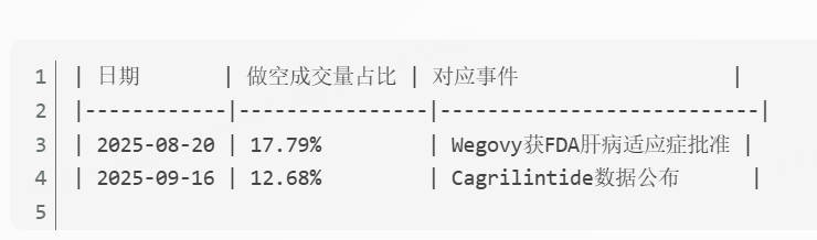 除了“直接利好”,深层催化因素同样让股价更有支撑。公司计划提交高剂量Wegovy(司美格鲁肽三倍剂量)的FDA申请,临床数据显示减重效果提升至19%,几乎追上 $礼来(LLY)$ 的替西帕肽(22.5%),在赛道上重新占据竞争高地。同时,近期做空压力缓解:9月16日做空成交占比12.68%,较8月18日高点17.79%明显回落,利好密集发布可能引发空头回补,让股价像开闸的水一样冲上去。