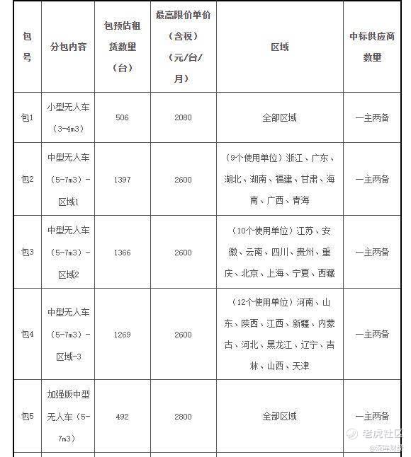 最新加入采购大军的是中国邮政。据其官网9月初发布的招标公告,中国邮政启动2025年无人车租赁采购项目,计划采购总量达7000台,采购内容包括小型无人车(3 - 4m³)718台、中型无人车(5 - 7m³)4524台、大型无人车(8 - 12m³)1758台,总规模高达7000台创下行业纪录。