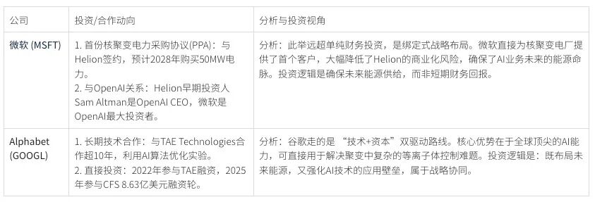 此类公司核心动机是为其耗能巨大的业务(如AI、云计算)寻找长期、稳定、零碳的基荷能源解决方案,并凭借强大的算力和AI能力反哺聚变研发。