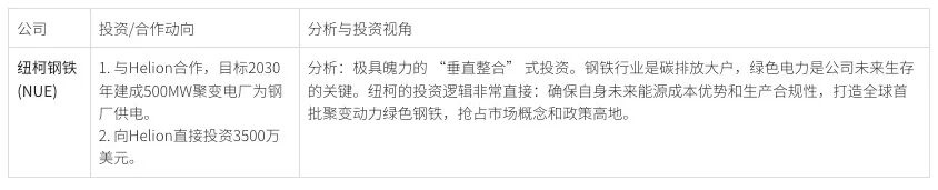 此类公司是未来聚变能源的直接用户,投资旨在提前锁定低成本、零碳的电力,以降低自身碳足迹并增强产品(如“绿色钢铁”)的竞争力。