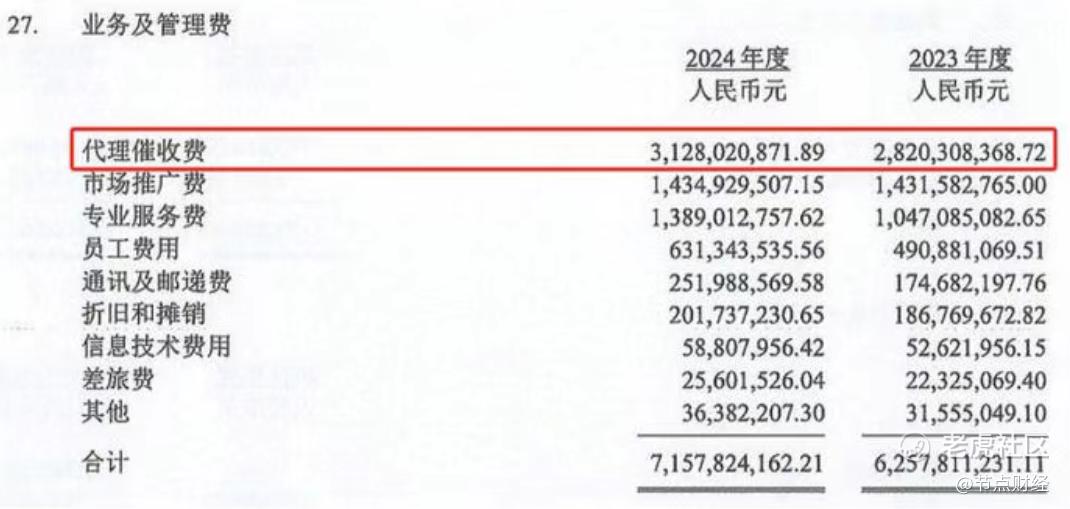 这一占比是否高于行业平均水平?《节点财经》查询,大部分同业并没有在报表中单独列示“代理催收费”,而是将之归于“外包服务费”或“外包费”等科目。