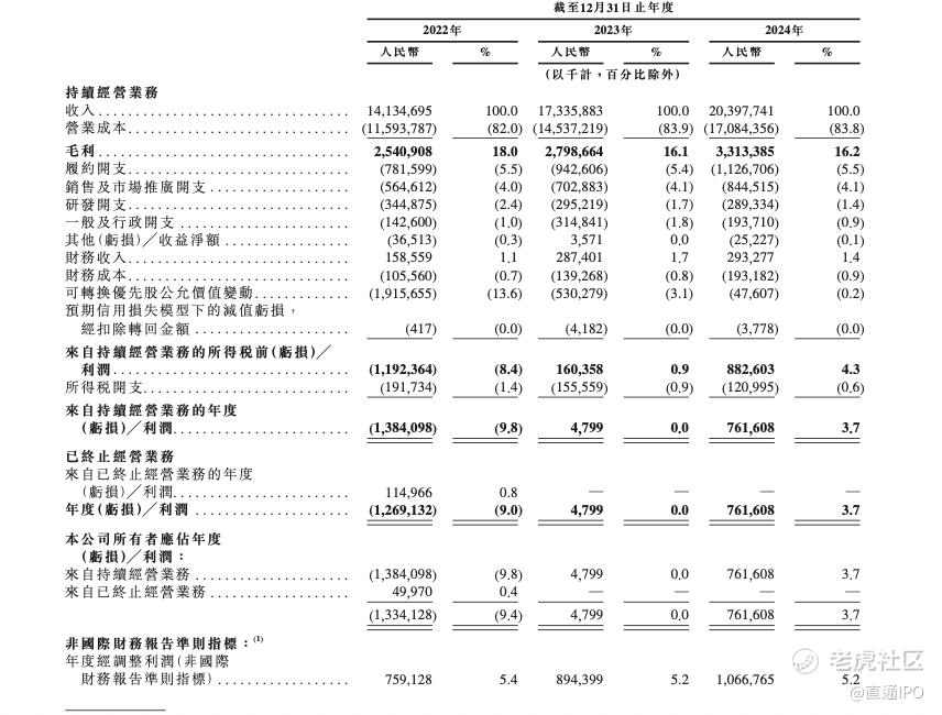 2022-2024年,京东工业持续经营业务的收入分别约141.35亿、173.36亿、203.98亿元;毛利分别约25.41亿、27.99亿、33.13亿元,毛利率分别为18.0%、16.1%、16.2%;来自持续经营业务的净利润分别约-13.84亿、479.9万、7.62亿元,净利润率分别为-9.8%、0、3.7%;经调整净利润(非国际财务报告准则指标)分别约7.59亿、8.94亿、10.67亿元,经调整净利润率分别为5.4%、5.2%、5.2%。