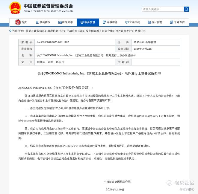 9月22日,中国证监会国际合作司发布关于JINGDONG Industrials, Inc.(京东工业股份有限公司,下称:京东工业)境外发行上市备案通知书,公司通过境内运营实体北京京东数智工业科技有限公司提交的境外发行上市备案材料收悉,公司拟发行不超过2.53亿股普通股并在香港联合交易所上市。